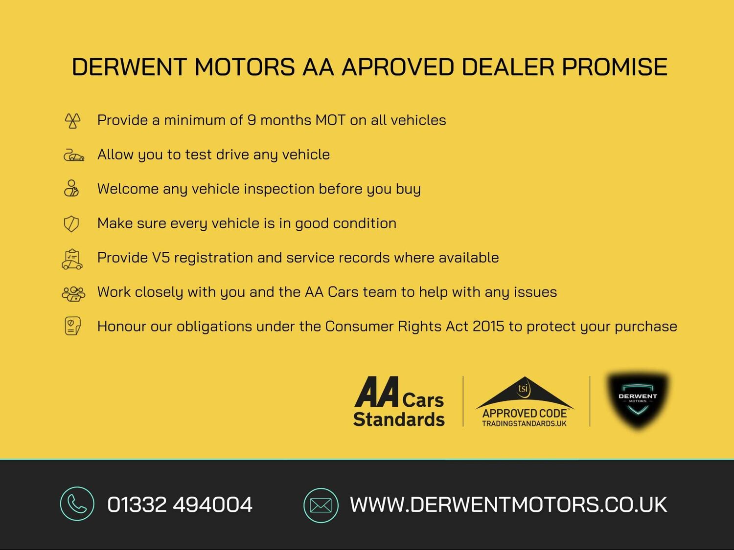 CONTACT - Our team can provide you with any additional information required - Email sales@derwentmotors.co.uk / Call 01332 494004 or 01332 942978 / Text/WhatsApp 07399022855.